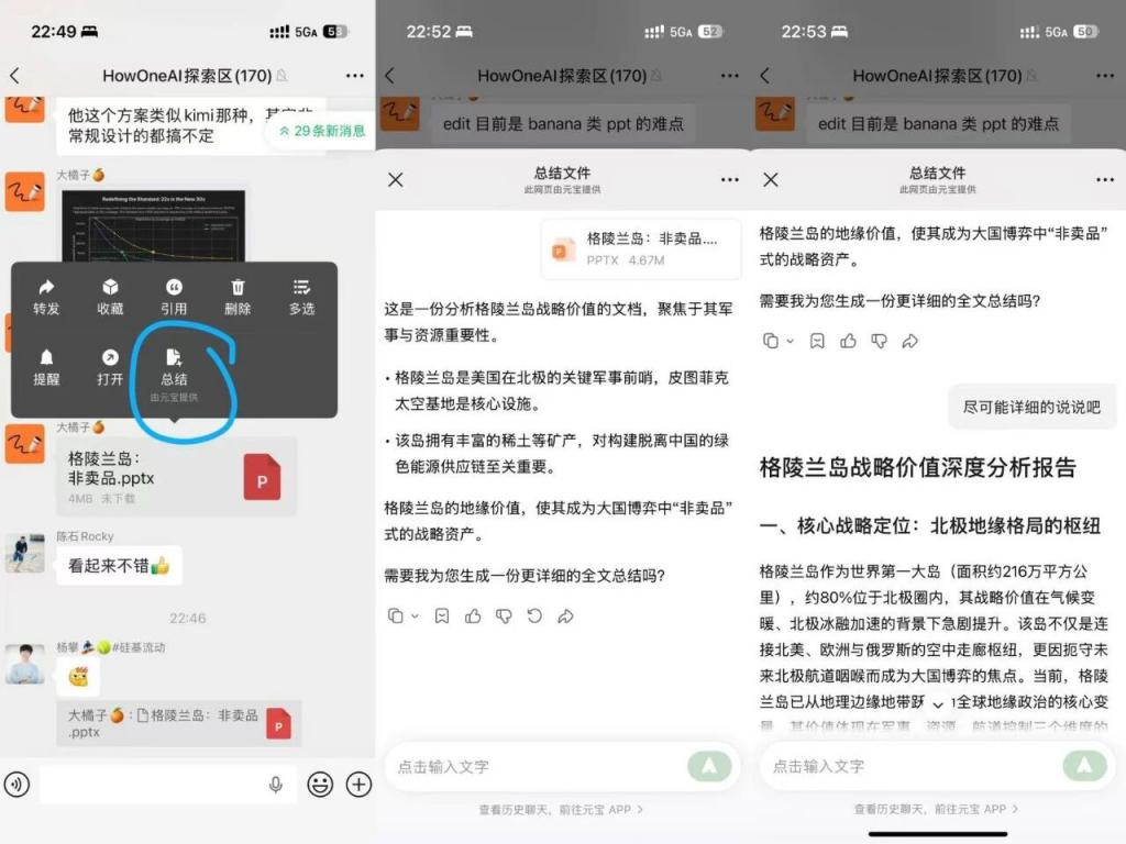 事实上,今天在微信群里已经正在内测使用元宝了——你可以让它总结文件、进行多轮对话。但有一个关键限制:仅自己可见,不破坏原有群聊的讨论结构。